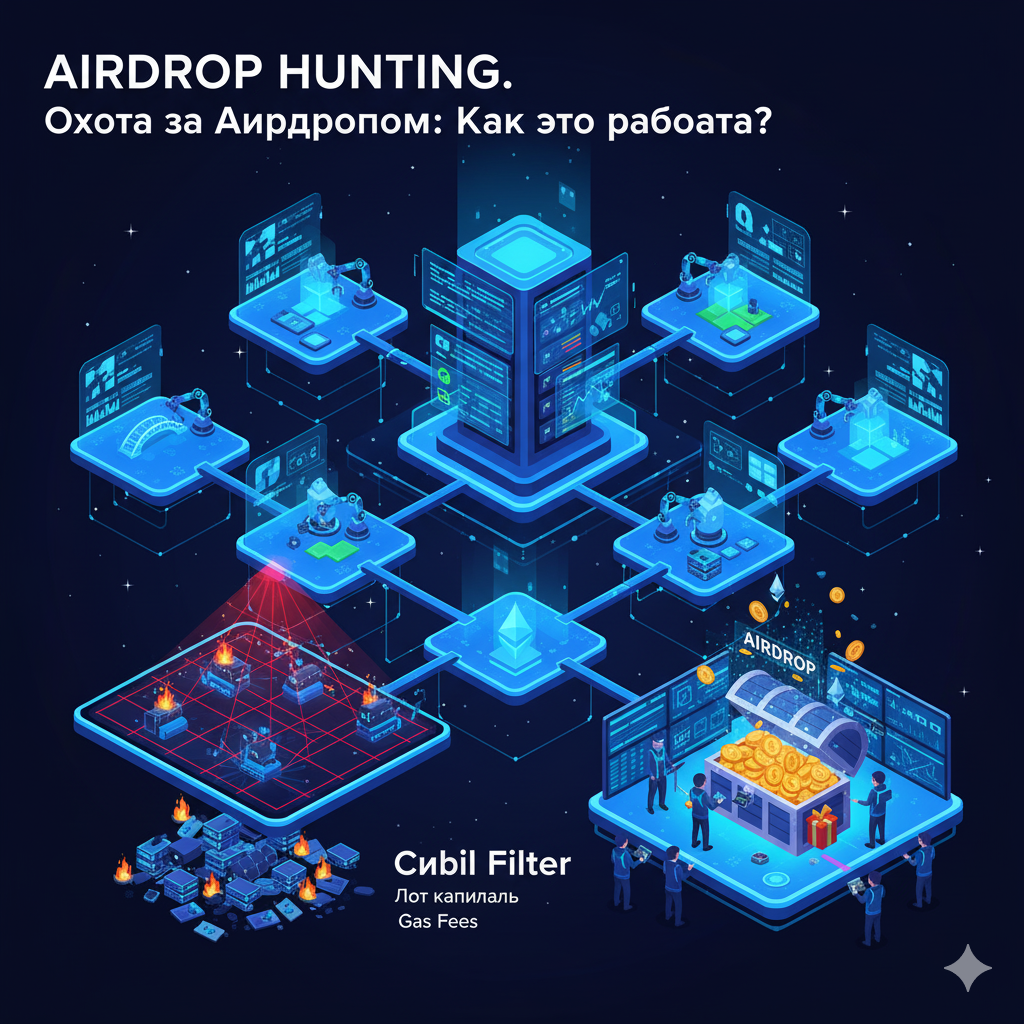 Аирдроп — это маркетинговая стратегия, когда web3-проект раздает свои нативные токены ранним пользователям. Вместо покупки рекламы в Google, проект платит своему первому комьюнити. “Охотники” (хантеры) — это профессионалы, которые пытаются “сымитировать” активность идеального пользователя на десятках проектов до того, как те объявят о “снимке” (snapshot) и раздаче.