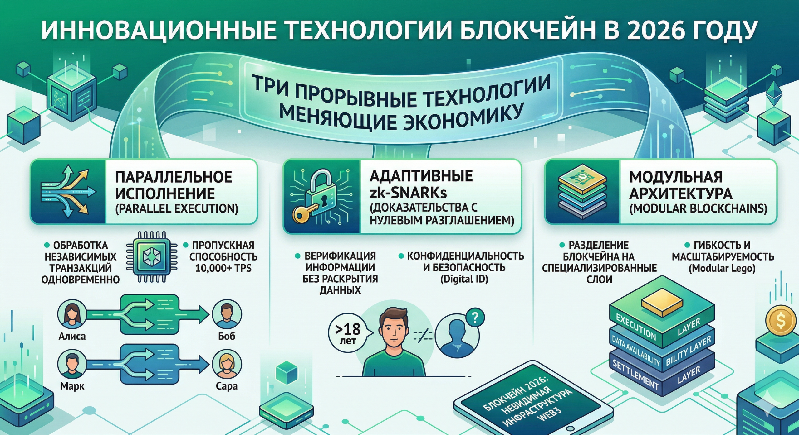 Инновации 2026 года превратили блокчейн из «медленной базы данных» в глобальную операционную систему. Параллельное исполнение дало скорость, zk-SNARKs обеспечили приватность, а модульность принесла гибкость.