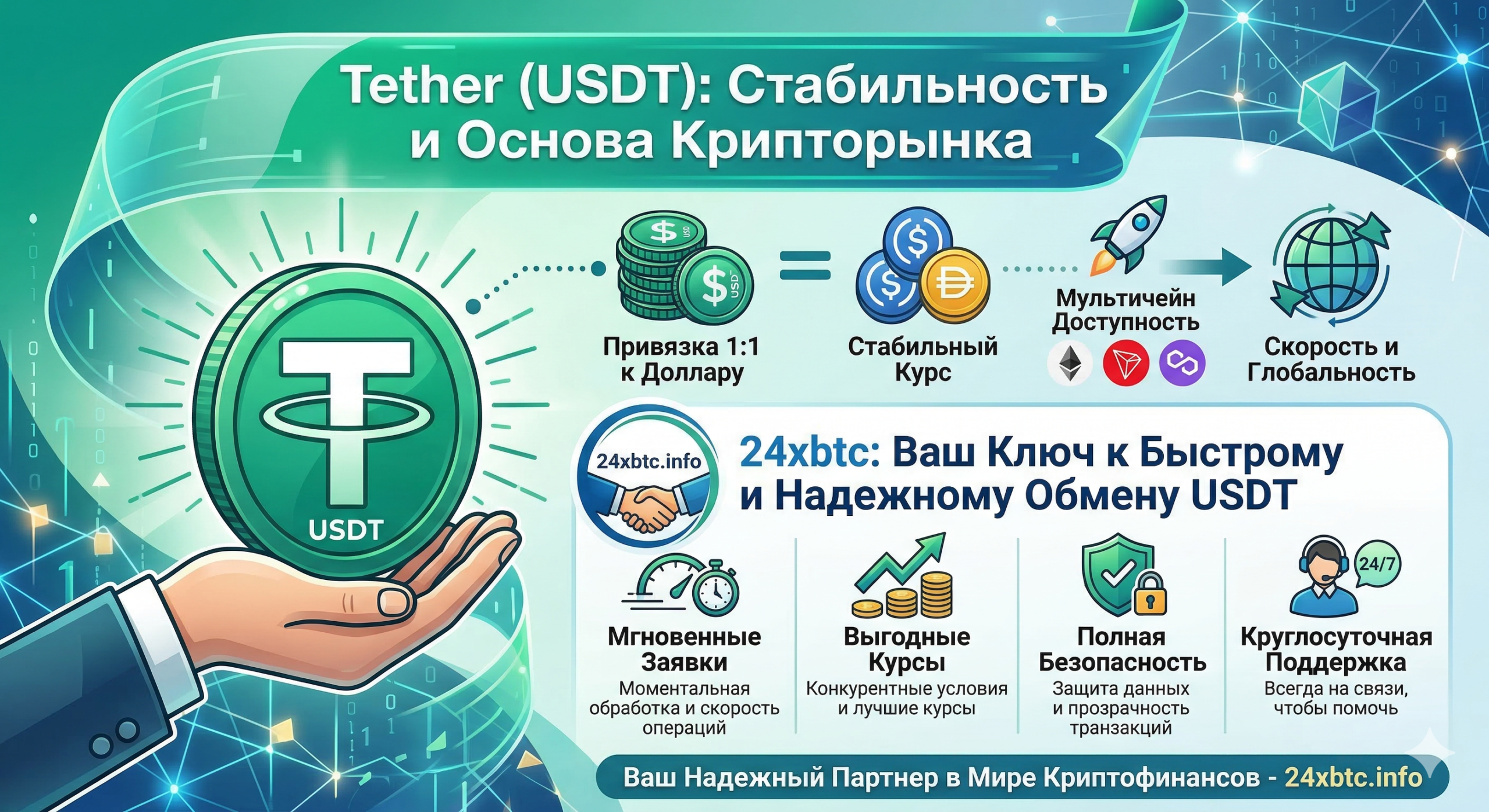 Tether — это кровь крипторынка, а 24xbtc — его надежная артерия. Используя связку из стабильного актива и проверенного сервиса, вы получаете полный контроль над своими финансами без границ и банковских ограничений.